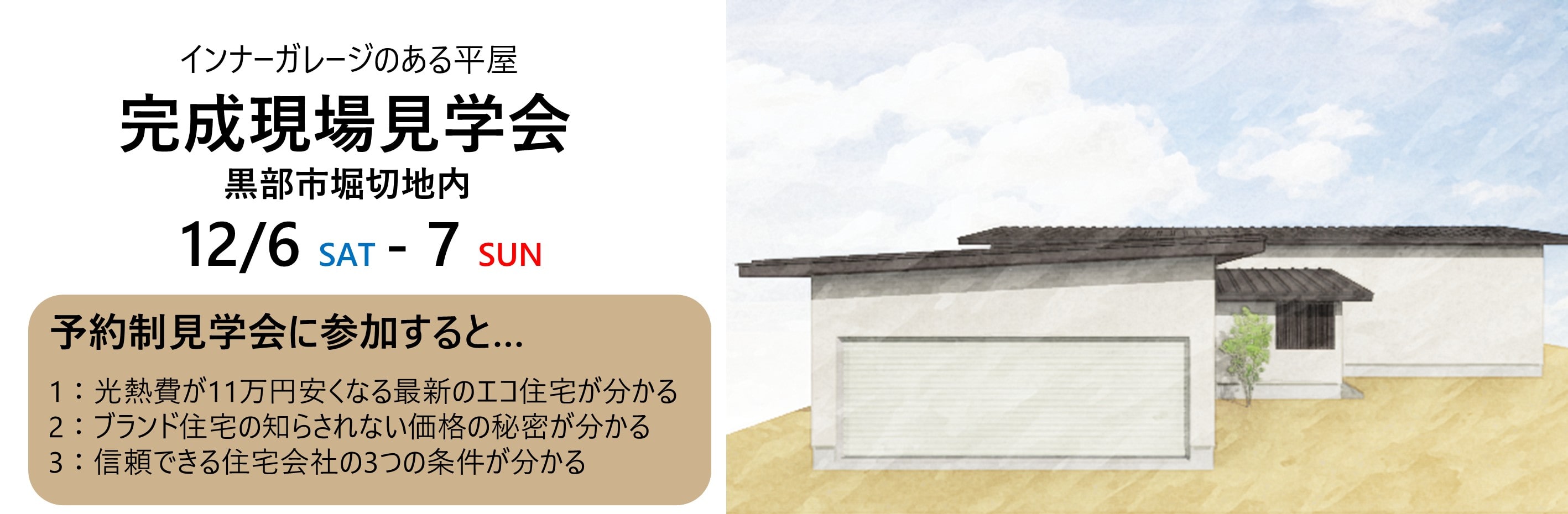 2025年12月7日(土)・9日(日)の2日間に限り、黒部市堀切地内にて『インナーガレージのある平屋』の完成見学会を開催します。皆様のご来場をお待ちしております。
