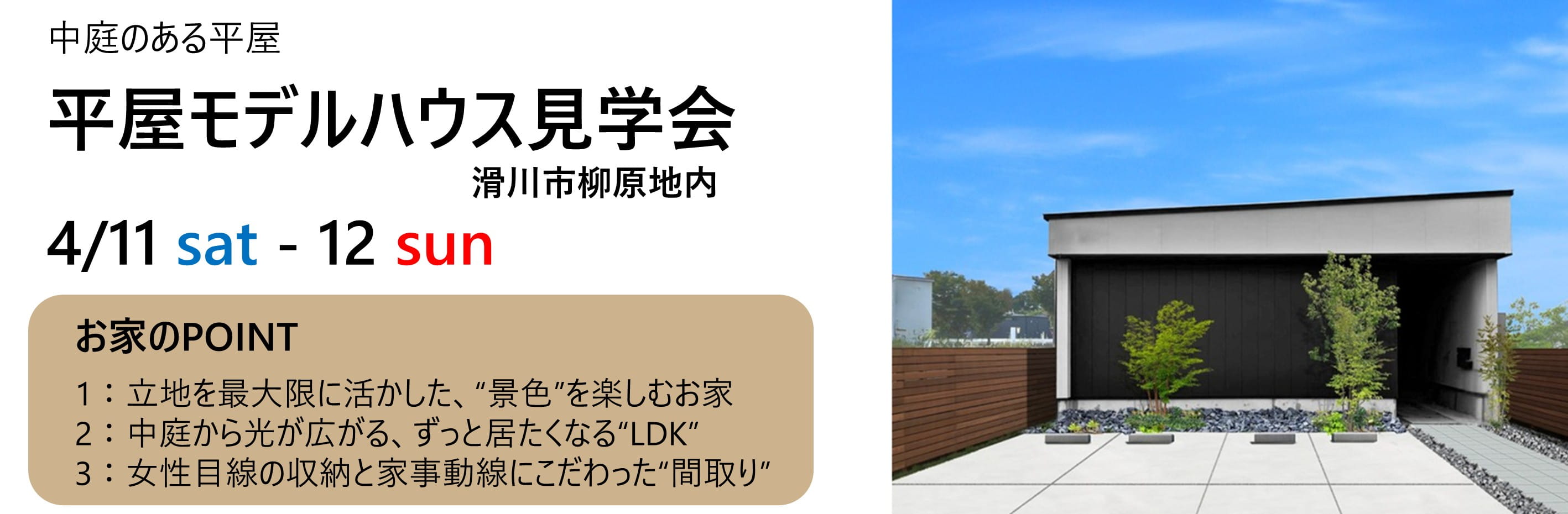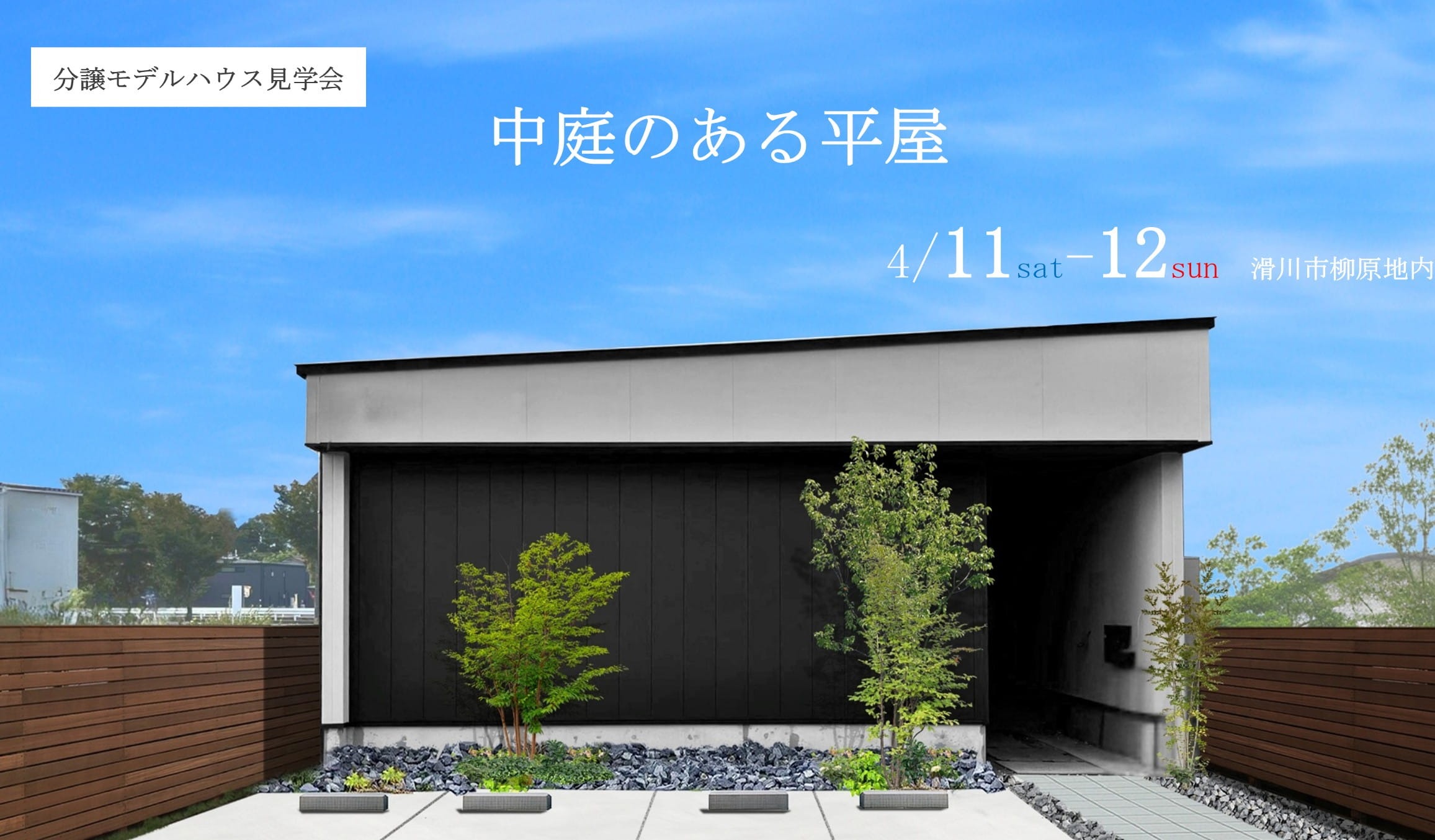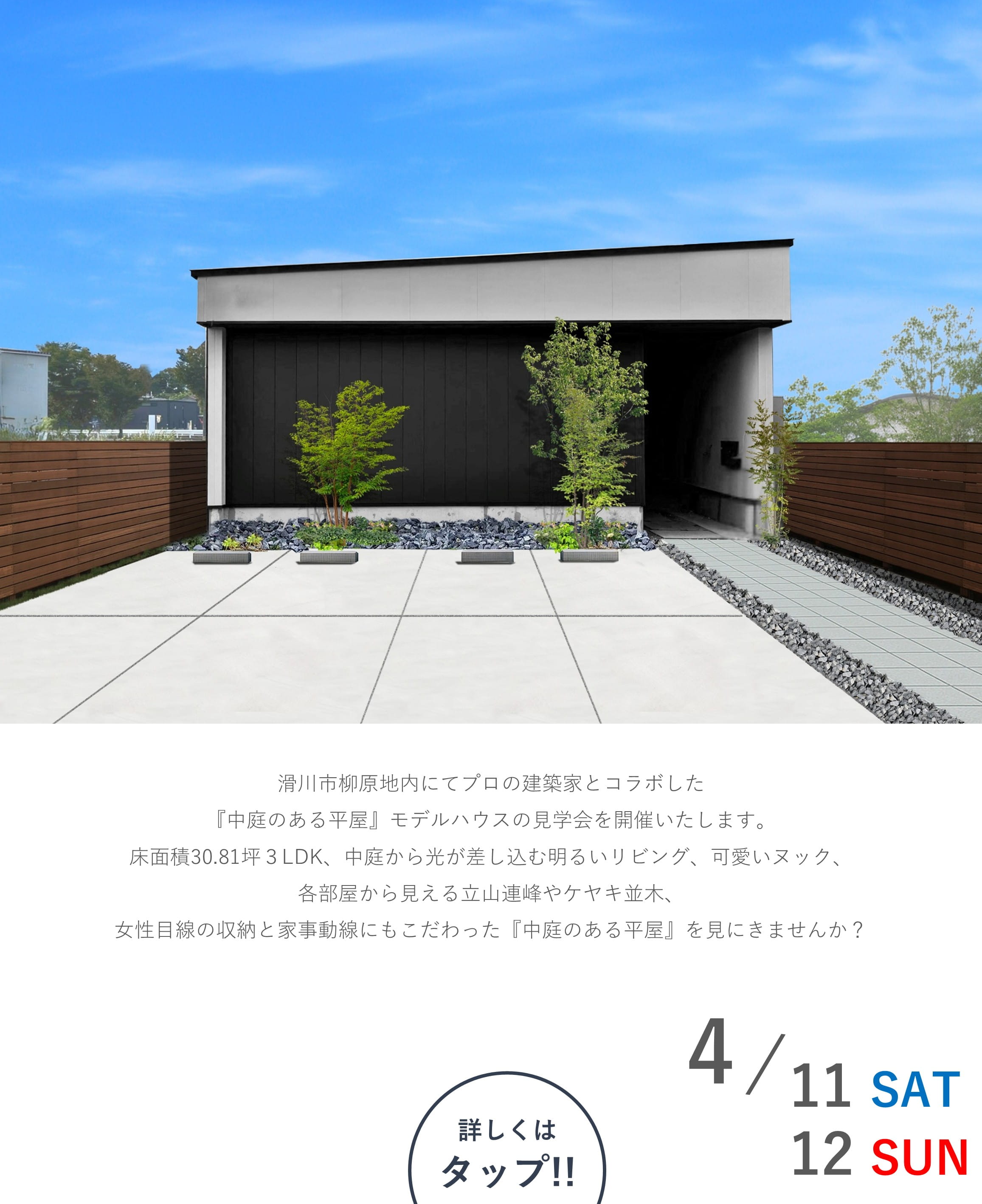 滑川市柳原地内にて、『31坪3LDK・中庭のある平屋』のモデルハウスを公開中!スタッフが常駐しておりませんので、お手数をおかけしますがご来場の際にはご予約をお願いいたします。