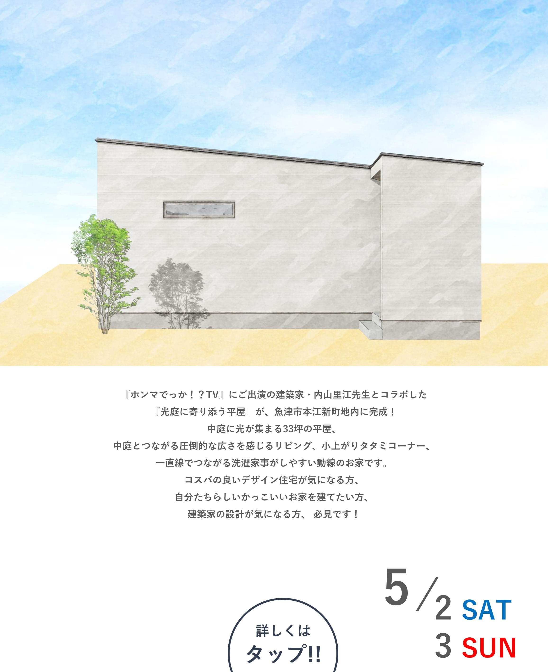 2026年5月2日(土)・3日(日)の2日間に限り、魚津市本江新町地内にて『光庭に寄り添う平屋』の完成見学会を開催します。中庭とつながるダイナミックなLDK、くつろぐ小上がりタタミコーナー、まっすぐのびる洗濯家事動線など、これからお住まいなられる等身大のお家を是非会場にてご体感ください!