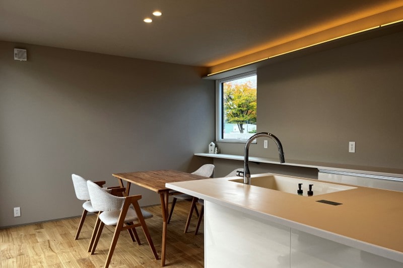 家族で調理がしやすいフラットキッチンやダイニングとリビングスペースをL型にすることで同じ空間で過ごしながらもそれぞれが別のことができるようにしました。