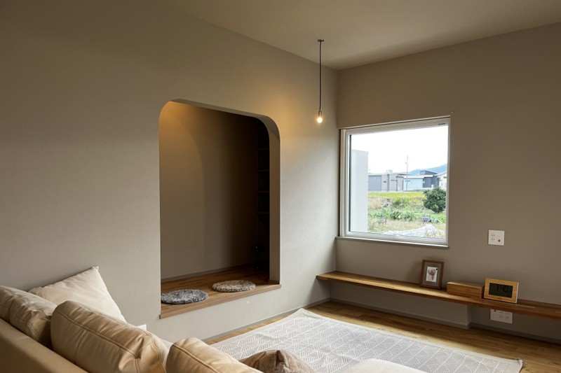 外からの視線を遮る腰壁はリビングの壁紙と同じ色味なので、中と外がつながっているようにより広々と感じます。