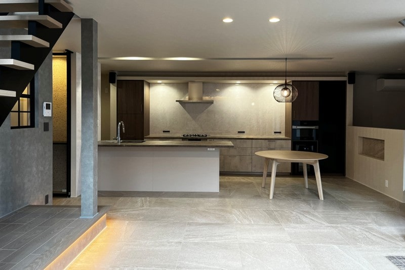 機能性、デザイン性にこだわったキッチン、タイルの床材や間接照明で、ホテルにいるような非日常を感じられるLDKです!