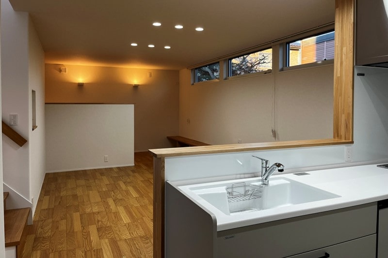 ■住宅に囲まれた立地を考慮し、中庭と階段上部の大きな窓からLDKに光が差し込む設計