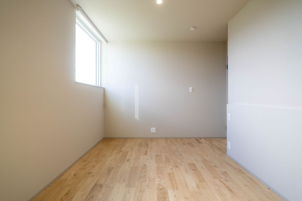 将来4.5帖ずつに間仕切りができるキッズルーム。造作棚とカウンターも設置。スクエア窓からは綺麗な立山連峰が。