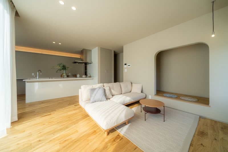 家族が一緒に過ごす時間が長いLDKが一番くつろげる場所になるように、「木目×グレージュ×白」の温かみのある落ち着いたインテリアに