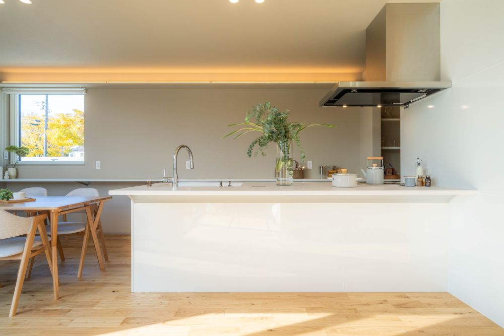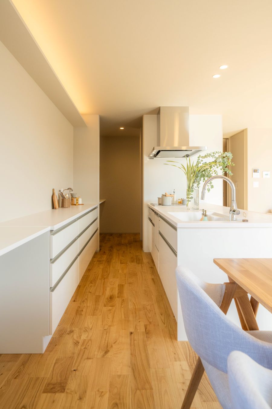 広くて真っ白なシステムキッチンを設置し、後ろには収納兼カウンターを。