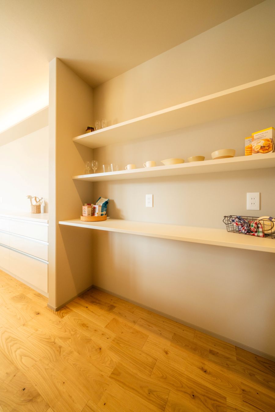 冷蔵庫やパントリーもリビングから見えにくいところに配置することで、生活感がないおしゃれなキッチンに。