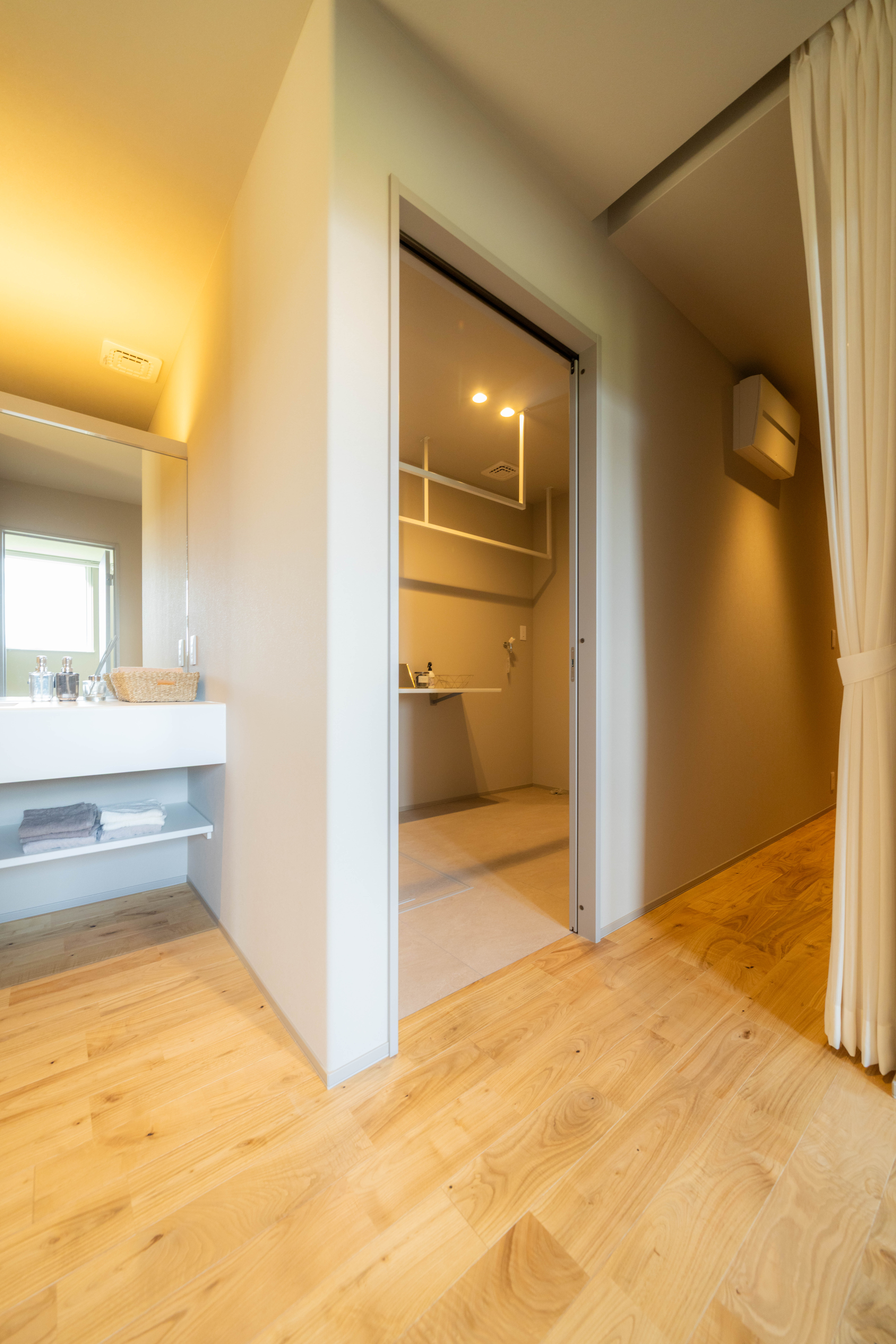 洗面コーナーの壁の上部を少しあけ、間接照明を施し、両方の採光や、玄関と洗面互いに声が届くようにもなっています。