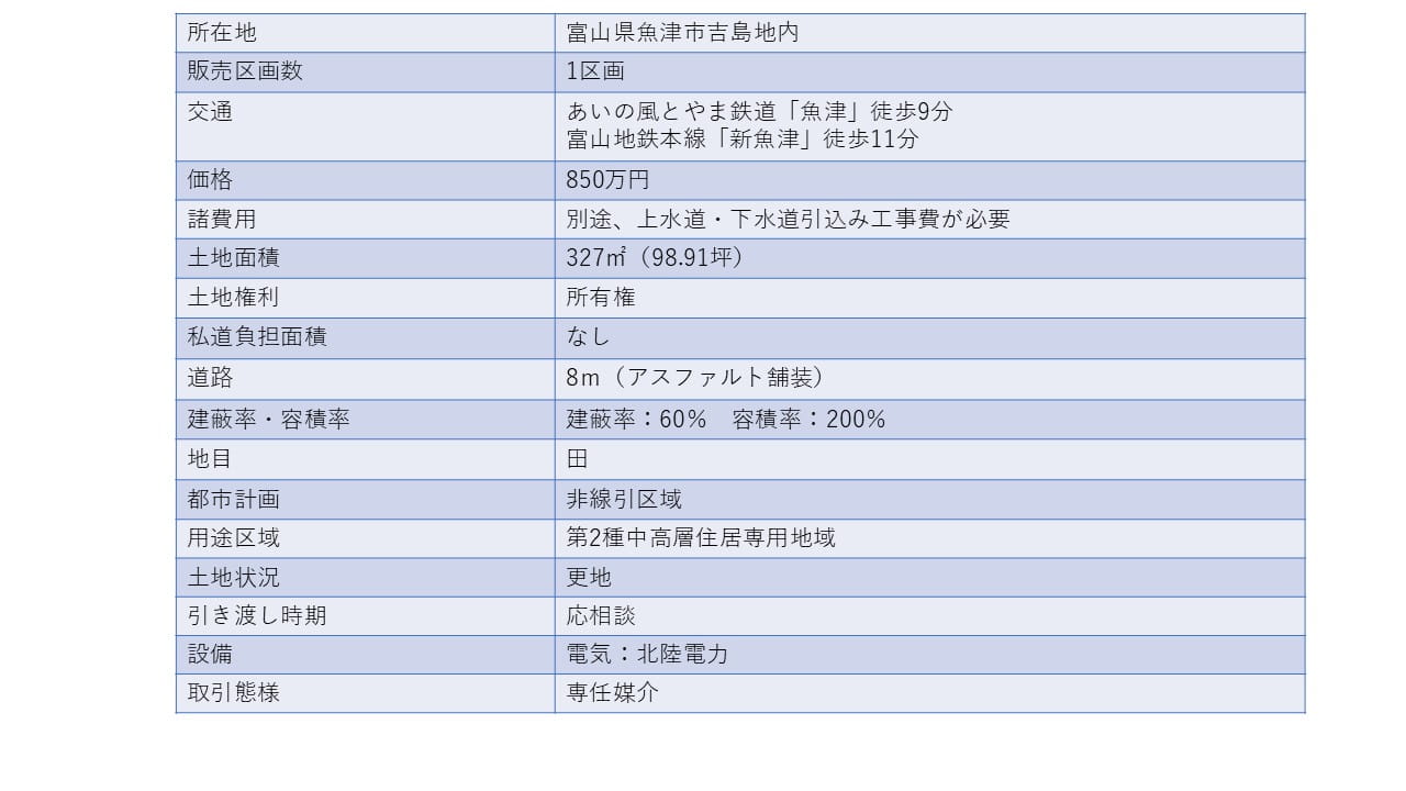 魚津駅まで徒歩9分!アップルヒルなどの商業施設が近く、利便性の良い場所です!■アップルヒルまで433m■魚津市立東部中学校まで831■魚津市立清流小学校まで1,323m