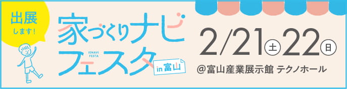 2月21日(土)・22日(日)の2日間、富山産業展示館テクノホールにて『家づくりナビフェスタ』に出展します!お気軽にブースにお立ち寄りください!