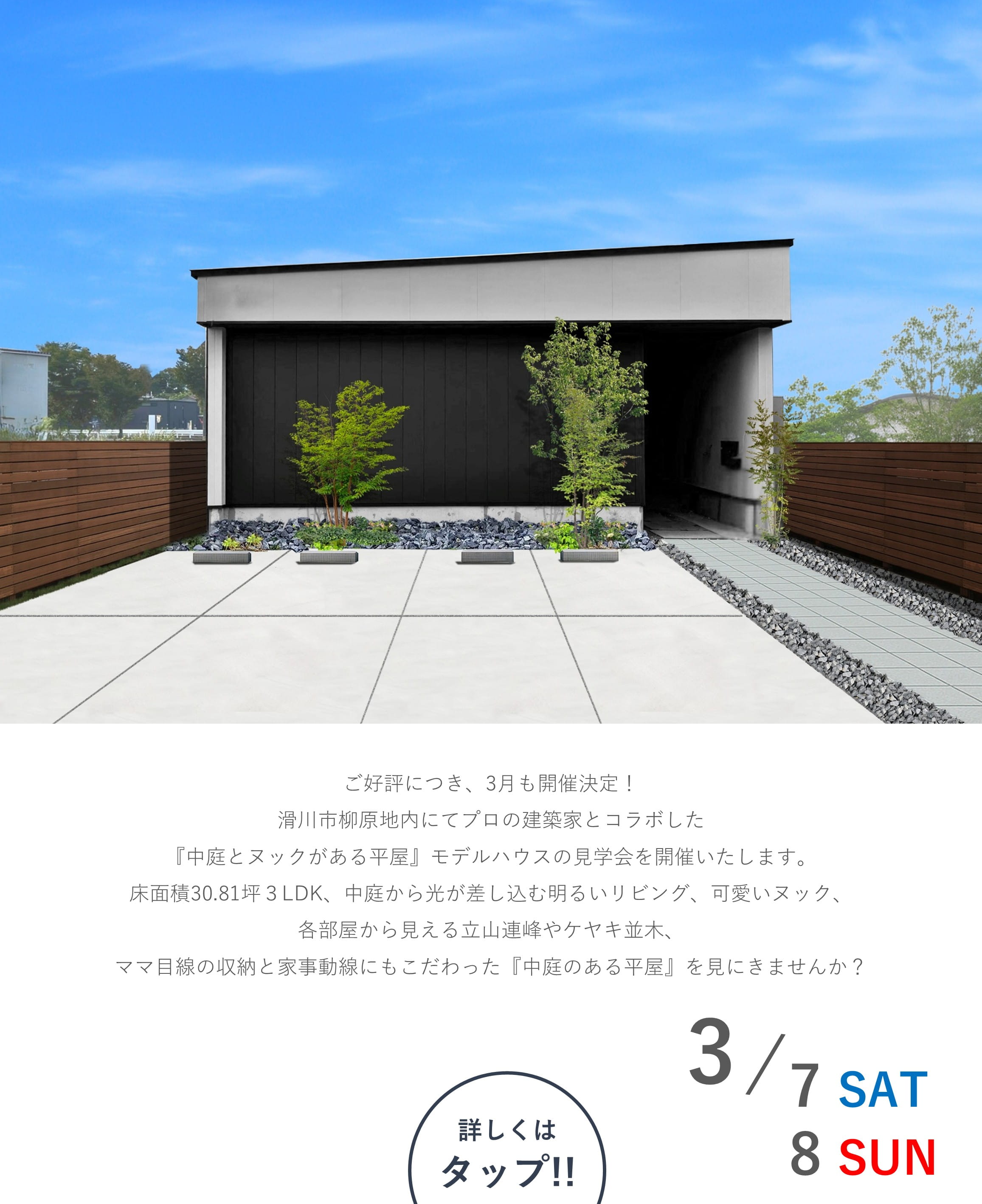 滑川市柳原地内にて、『31坪3LDK・中庭のある平屋』のモデルハウスを公開中!スタッフが常駐しておりませんので、お手数をおかけしますがご来場の際にはご予約をお願いいたします。