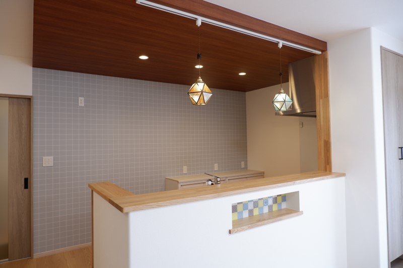 キッチン前のニッチのタイルはお施主様がご準備され、ご自身でタイルを貼られました!