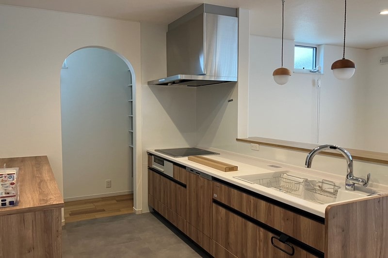 キッチンの奥にはパントリーへと続くアーチ型の垂れ壁や、オシャレな照明で可愛らしさをプラスしています。