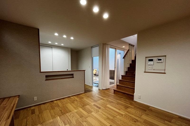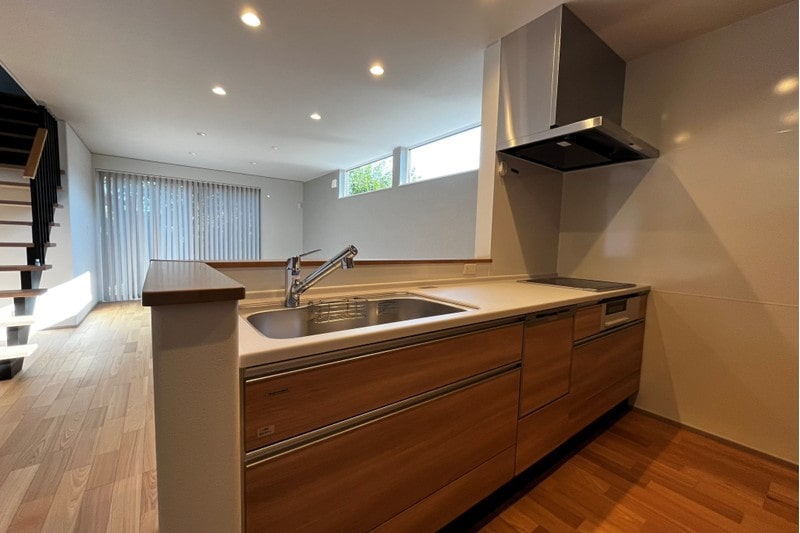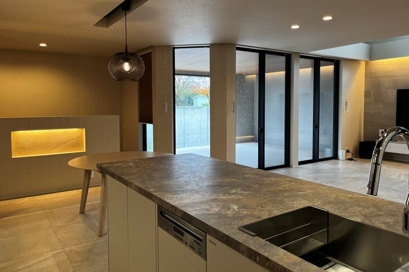 機能性、デザイン性にこだわったキッチン、タイルの床材や間接照明で、ホテルにいるような非日常を感じられるLDKです!