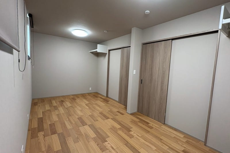 ニレの床材にグレーのクロス、建具はグレージュアッシュ色で統一しました。
