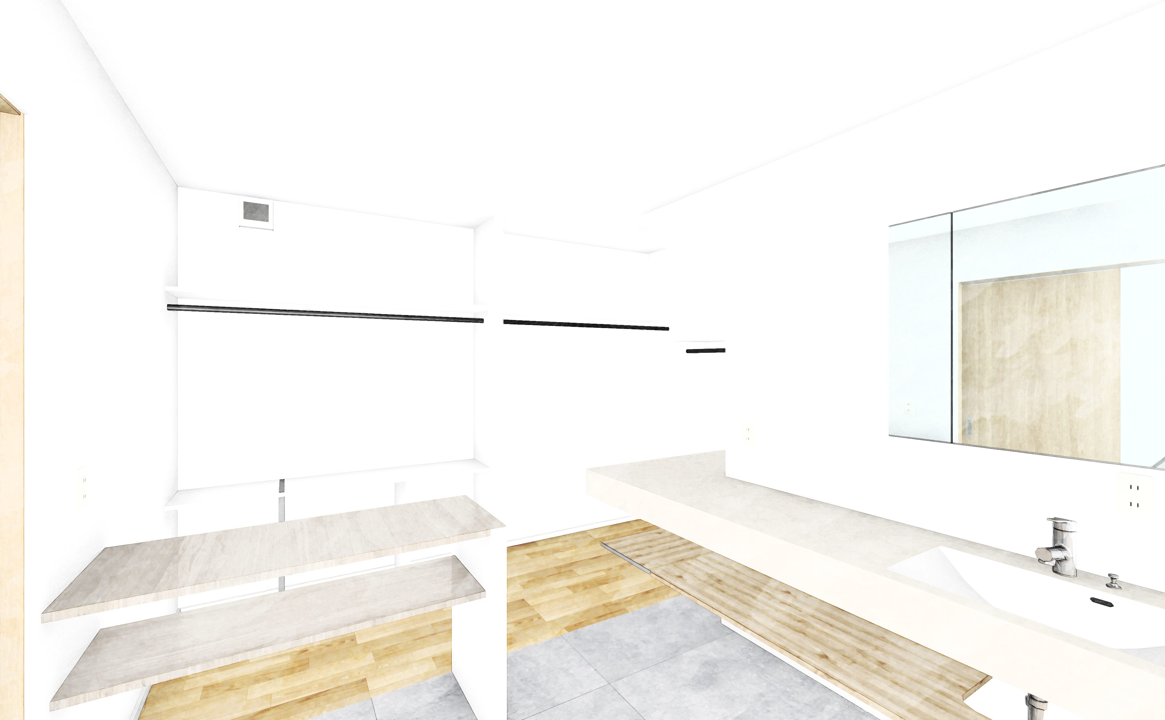 アイカ工業のL型の洗面カウンターは、身支度やアイロンがけなどにも使える”あったら便利”なスペースです。