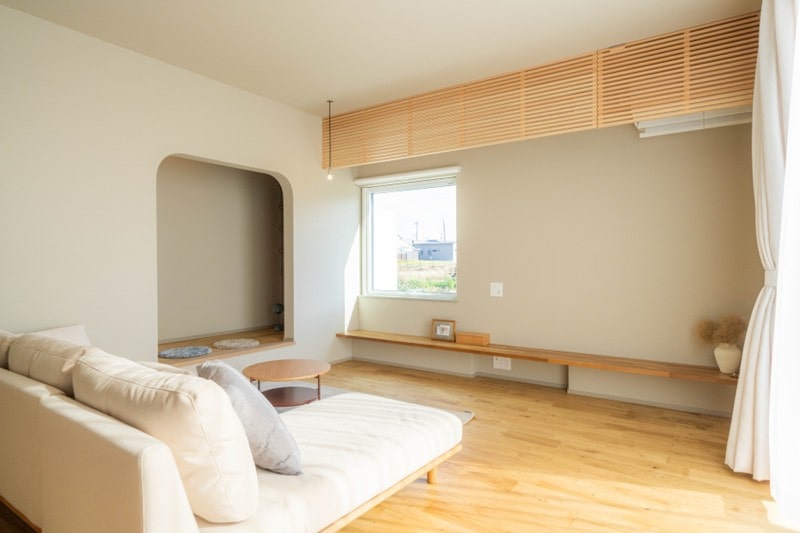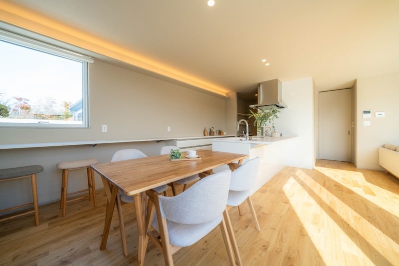 家族が一緒に過ごす時間が長いLDKが一番くつろげる場所になるように、「木目×グレージュ×白」の温かみのある落ち着いたインテリアに