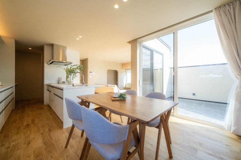中庭テラスから光がLDKに広がり、明るく気持ちが前向きに。